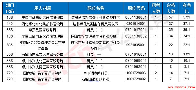 截止到17日16時(shí),競(jìng)爭(zhēng)比例的職位為寧夏回族自治區(qū)通信管理局信息通信發(fā)展處主任科員及以下一職,招錄1人,截止到17日16時(shí)合格人數(shù)為57人,具體信息如下: