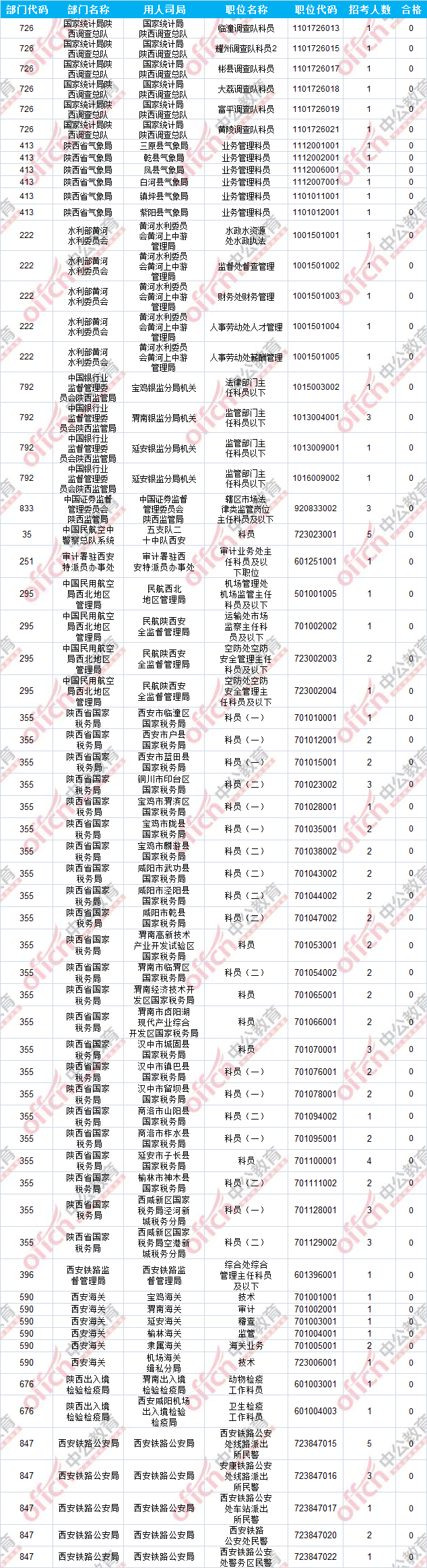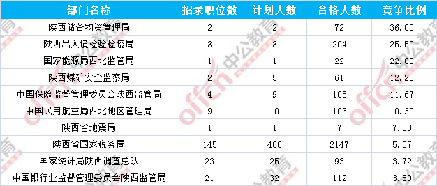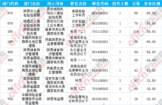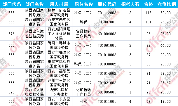 報(bào)名通過審核人數(shù)前十的職位主要集中在陜西省國家稅務(wù)局及陜西出入境檢驗(yàn)檢疫局兩大部門,具體信息如下: