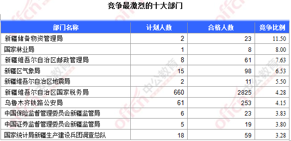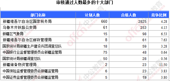 為幫助廣大考生更清晰的了解今日?qǐng)?bào)名情況,新疆中公網(wǎng)校整理了審核通過人數(shù)前十位的部門以及競(jìng)爭(zhēng)比例最激烈的十大部門,供廣大考生參考: