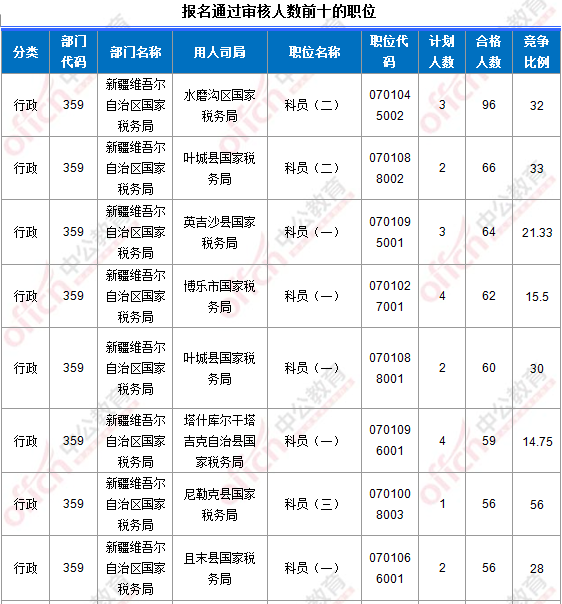報(bào)名通過審核人數(shù)前十的職位主要集中在新疆維吾爾自治區(qū)國家稅務(wù)局、烏魯木齊鐵路公安局等部門,具體信息如下: