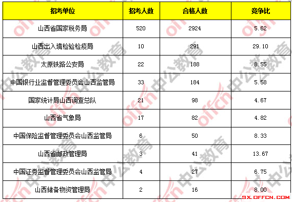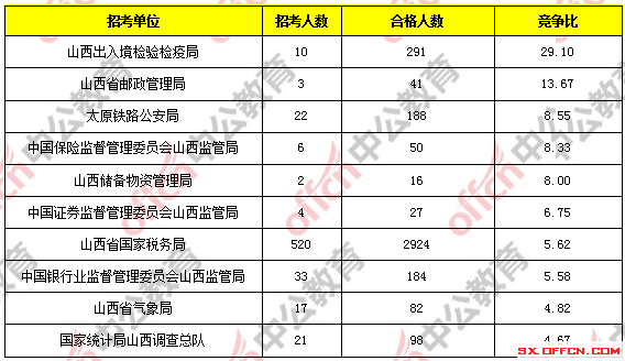 為幫助廣大考生更清晰的了解今日?qǐng)?bào)名情況,山西中公網(wǎng)校整理了合格人數(shù)前十位的部門(mén)以及競(jìng)爭(zhēng)比例最激烈的十大部門(mén),供廣大考生參考:
