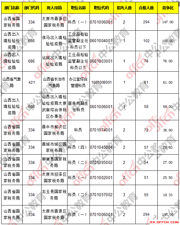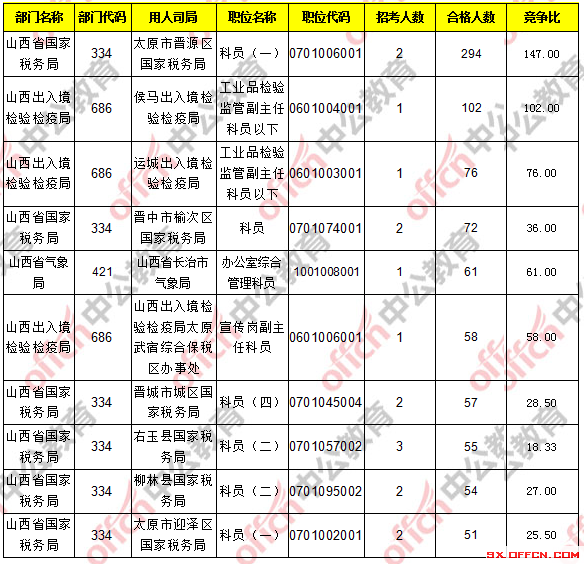 報(bào)考人數(shù)前十的職位主要集中在山西省國(guó)家稅務(wù)局、山西出入境檢驗(yàn)檢疫局這兩個(gè)部門(mén),具體信息如下:
