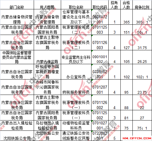 截止到18日8時,競爭比例的職位為內(nèi)蒙古儲備物資管理局倉庫管理與基本建設(shè)處主任科員及以下一職,招錄1人,截止到18日8時通過人數(shù)為365人!