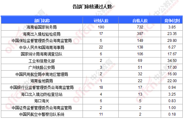 截止到18日8時,各部門報名人數(shù)已陸續(xù)上漲,全部部門都已有人報名,國稅局與出入境檢驗檢疫局包攬大部分報名人數(shù),截至統(tǒng)計時間:海南省國家稅務(wù)局共報名732人,出入境檢驗檢疫局共報名397人,兩部門合1129人,共占了總報名人數(shù)的65.07%!