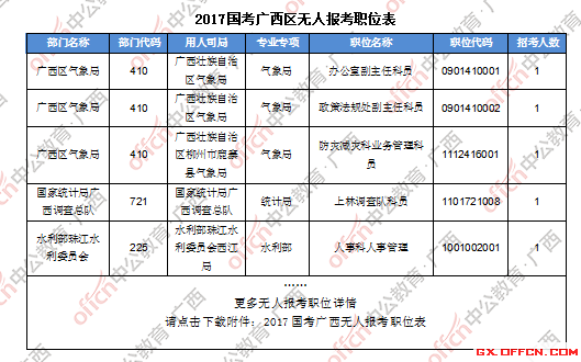 截止到18日8時(shí),工作地點(diǎn)在廣西的職位共有128個(gè)無人報(bào)考,占全部職位的19.9%。下面是部分廣西無人報(bào)考職位一覽表,更多無人報(bào)考職位詳情請(qǐng)下載附件,廣西中公網(wǎng)校專家建議廣大考生結(jié)合自身?xiàng)l件,根據(jù)自己的實(shí)際情況找到屬于自己的職位,避免激烈競爭。