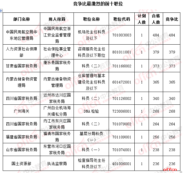 從前十名來看,排名也有一些調(diào)整,廣州海關(guān)廣州白云機(jī)場(chǎng)海關(guān)緝私分局DNA檢驗(yàn)職位(職位代碼723006001)和國(guó)土資源部執(zhí)法監(jiān)察局檢查指導(dǎo)處主任科員及以下職位(職位代碼401006001)進(jìn)入前十行列競(jìng)爭(zhēng)比分別為238:1、236:1。