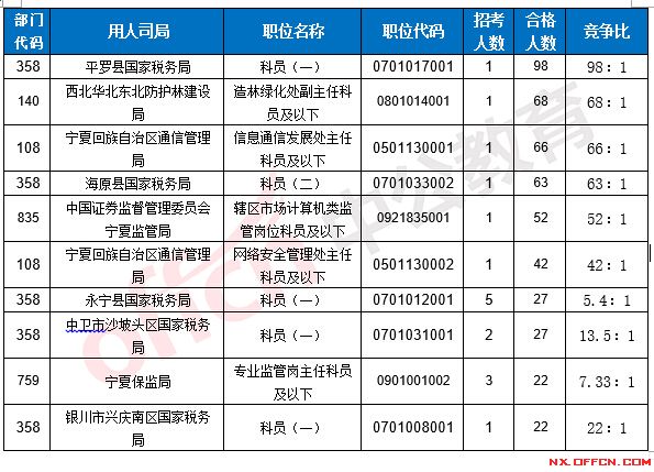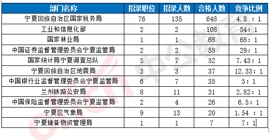 截止到18日16時(shí),寧夏國(guó)考合格人數(shù)前三位的部門依次是:寧夏回族自治區(qū)國(guó)家稅務(wù)局、工業(yè)和信息化部、國(guó)家林業(yè)局。