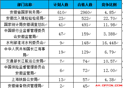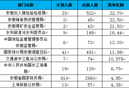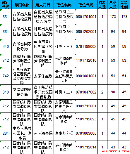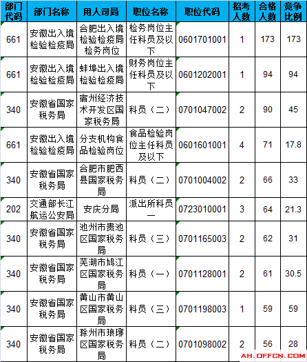 報(bào)名通過審核人數(shù)前十的職位主要集中在安徽出入境檢驗(yàn)檢疫局、安徽省國(guó)家稅務(wù)局、交通部長(zhǎng)江航運(yùn)公安局這三個(gè)部門,具體信息如下: