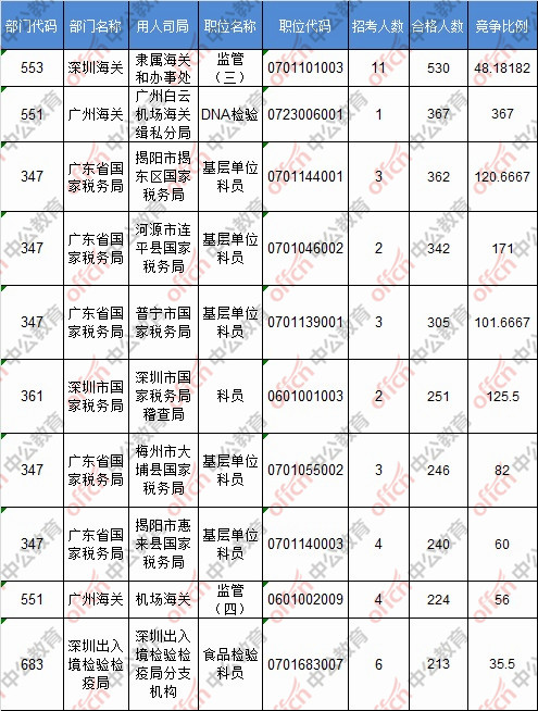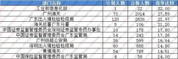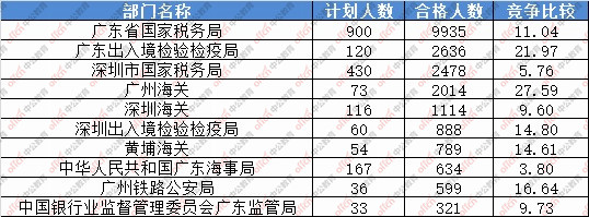 為幫助廣大考生更清晰的了解今日報名情況,廣東中公教育整理了審核通過人數(shù)前十位的部門以及競爭比例最激烈的十大部門,供廣大考生參考:
