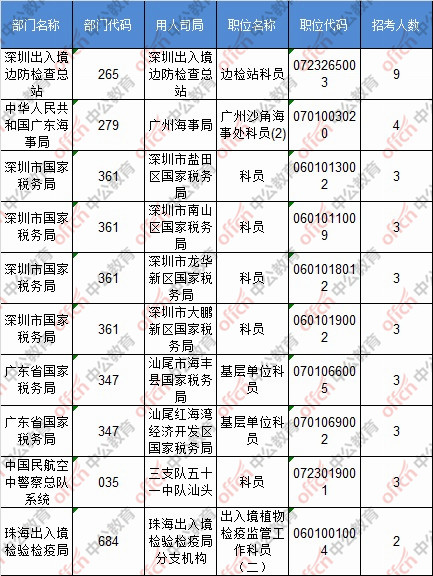 報名通過審核人數(shù)前十的職位主要集中在深圳海關(guān)、廣州海關(guān)、廣東省國家稅務(wù)局,具體信息如下: