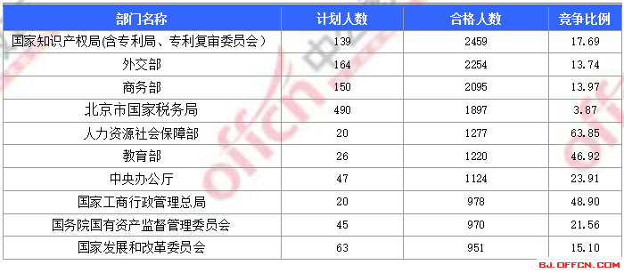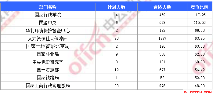 為幫助廣大考生更清晰的了解今日報名情況,北京中公網(wǎng)校整理了合格人數(shù)前十位的部門以及競爭比例最激烈的十大部門,供廣大考生參考: