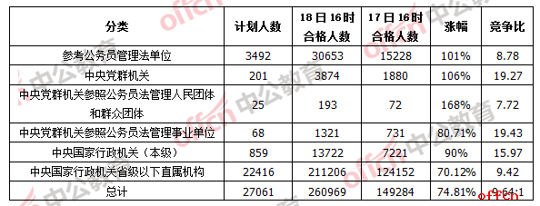 與昨日相比,各個系統(tǒng)的合格人數(shù)都進行了大幅度增長,漲幅的是中央黨群機關參照公務員法管理人民團體和群眾團體,以168%的漲幅列居首位,漲幅最低的是中央國家行政機關省級以下直屬機構,漲幅也在70%以上,目前正是報名高峰期,預計未來幾天各系統(tǒng)的報名人數(shù)仍將直線式增長。
