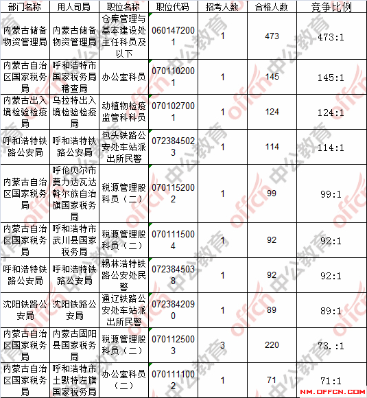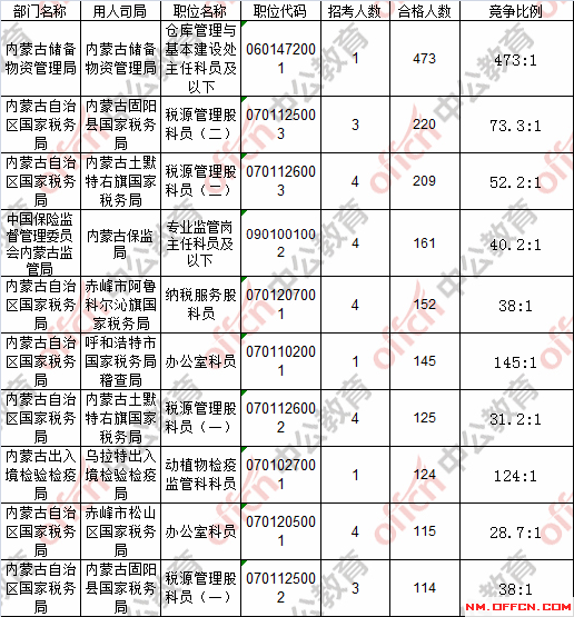 報名通過審核人數(shù)前十的職位主要集中在內(nèi)蒙古儲備物資管理局、內(nèi)蒙古固陽縣國家稅務(wù)局、內(nèi)蒙古土默特右旗國家稅務(wù)局等部門,具體信息如下: