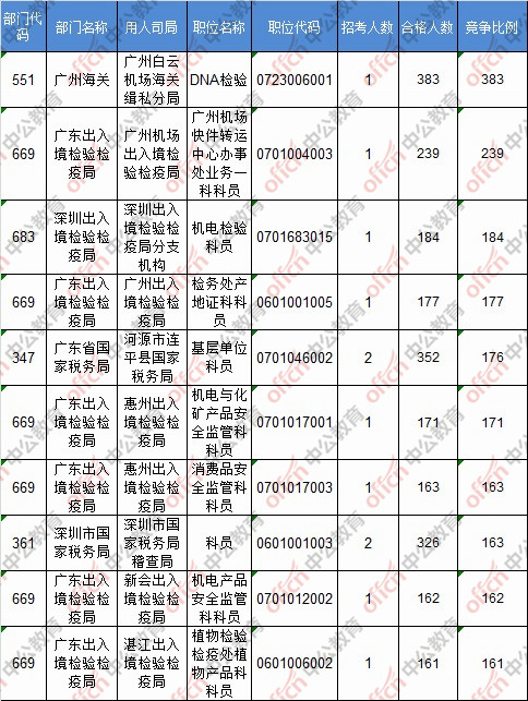 截止到19日8時(shí),競(jìng)爭(zhēng)比例的職位為廣州海關(guān)廣州白云機(jī)場(chǎng)海關(guān)緝私分局DNA檢驗(yàn)一職,招錄1人,截止到19日8時(shí)通過(guò)人數(shù)為383人。
