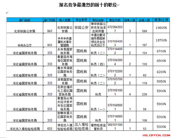報(bào)名通過(guò)審核人數(shù)前十的職位主要集中在北京鐵路公安局、河北省國(guó)家稅務(wù)局、中央辦公廳等部門,具體信息如下: