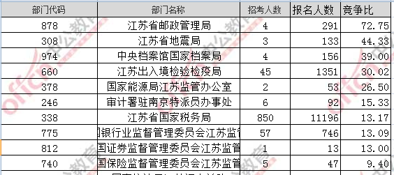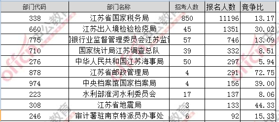 截至19日16時,據(jù)江蘇中公網(wǎng)校統(tǒng)計,2017國考招錄職位中工作地點在江蘇的職位通過審核總?cè)藬?shù)為15094人,共有33個職位無人通過審核,相比去年同期增加了1509人,平均競爭比例為13:1。