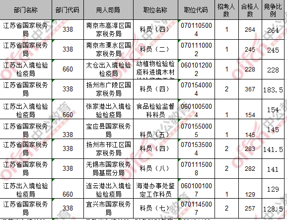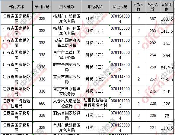 報名通過審核人數(shù)前十的職位主要集中在江蘇省國家稅務(wù)局、江蘇出入境檢驗檢疫局,具體信息如下: