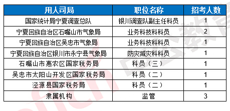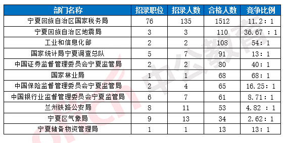 截止到19日16時(shí),寧夏國考合格人數(shù)前三位的部門依次是:寧夏回族自治區(qū)國家稅務(wù)局、寧夏回族自治區(qū)地震局、工業(yè)和信息化部,銀川海關(guān)無人報(bào)考。