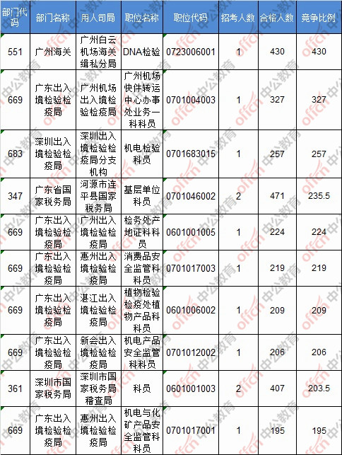 截止到19日16時(shí),競爭比例的職位為廣州海關(guān)廣州白云機(jī)場海關(guān)緝私分局DNA檢驗(yàn)一職,招錄1人,截止到19日8時(shí)通過人數(shù)為430人。