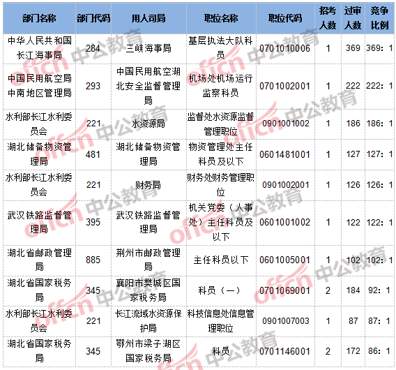 截止到10月19日16時,報名通過審核人數和競爭比例的職位為三峽海事局基層執(zhí)法大隊科員一職,招錄1人,過審人數369人,競爭比例為369:1。具體信息如下: