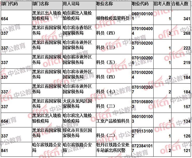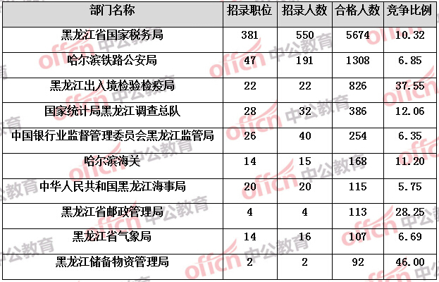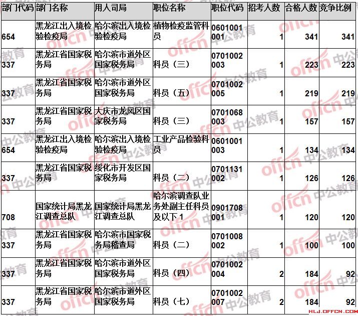 報名通過審核人數(shù)前十的職位主要集中在黑龍江省國家稅務(wù)局、黑龍江出入境檢驗(yàn)檢疫局、哈爾濱鐵路公安局等部門,具體信息如下: