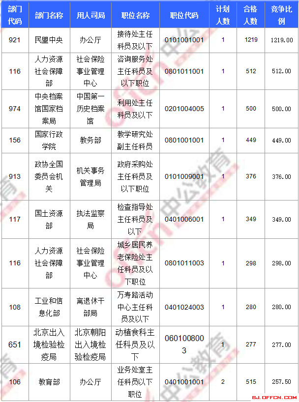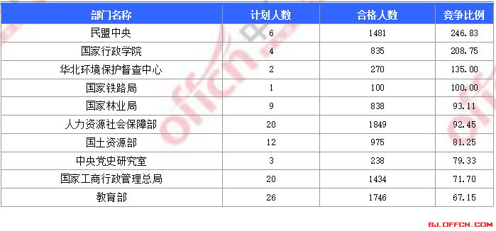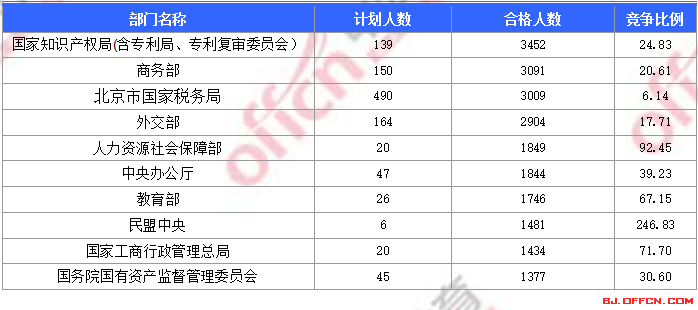 為幫助廣大考生更清晰的了解今日?qǐng)?bào)名情況,北京中公網(wǎng)校整理了合格人數(shù)前十位的部門以及競(jìng)爭(zhēng)比例最激烈的十大部門,供廣大考生參考: