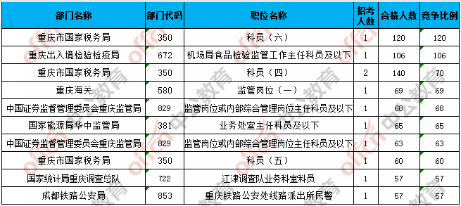 合格人數(shù)前十的職位主要集中在重慶市國(guó)家稅務(wù)局、重慶出入境檢驗(yàn)檢疫局、國(guó)家統(tǒng)計(jì)局重慶調(diào)查總隊(duì)等部門,具體信息如下: