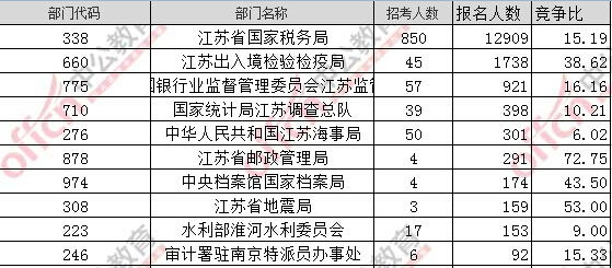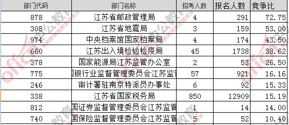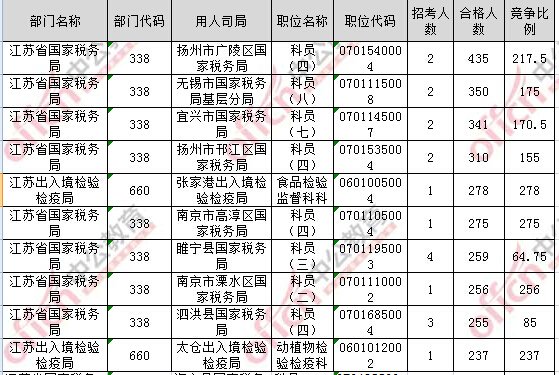 報名通過審核人數(shù)前十的職位主要集中在江蘇省國家稅務局、江蘇出入境檢驗檢疫局,具體信息如下: