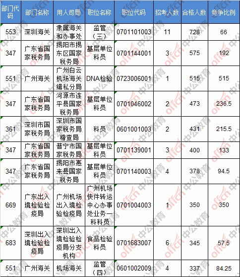 報名通過審核人數(shù)前十的職位主要集中在深圳海關(guān)、廣東省國家稅務(wù)局、廣州海關(guān),具體信息如下: