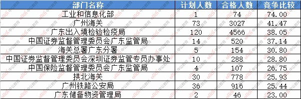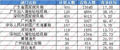 為幫助廣大考生更清晰的了解今日報名情況,廣東中公網(wǎng)校整理了審核通過人數(shù)前十位的部門以及競爭比例最激烈的十大部門,供廣大考生參考: