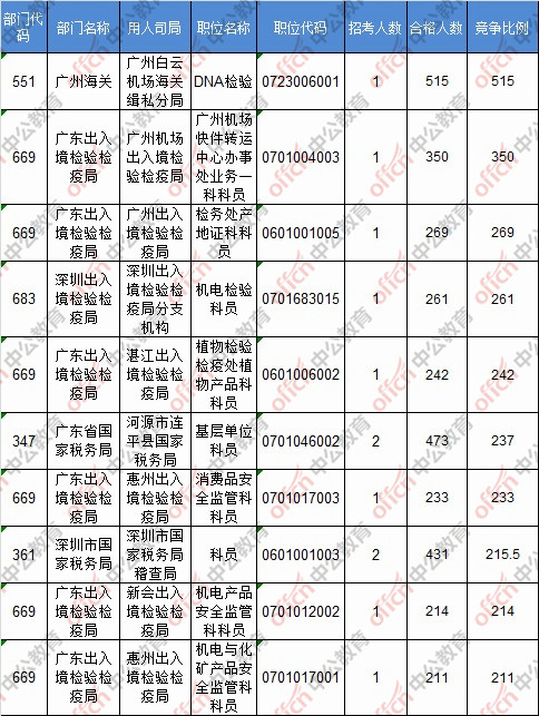 截止到20日8時,競爭比例的職位為廣州海關(guān)廣州白云機場海關(guān)緝私分局DNA檢驗一職,招錄1人,截止到20日8時通過人數(shù)為515人。