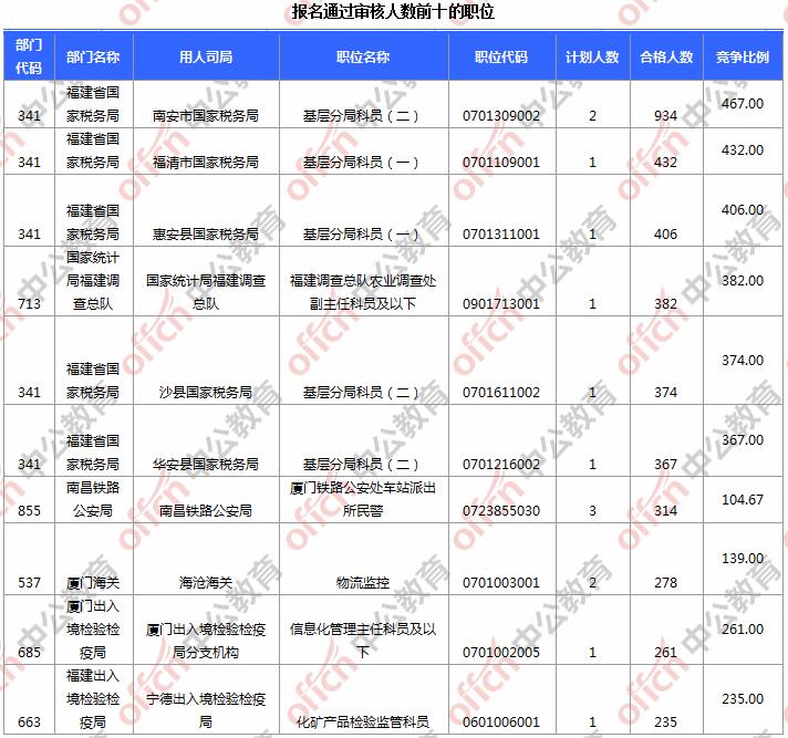 報(bào)名通過審核人數(shù)前十的職位主要集中在南安市國家稅務(wù)局、福清市國家稅務(wù)局、惠安縣國家稅務(wù)局等部門,具體信息如下: