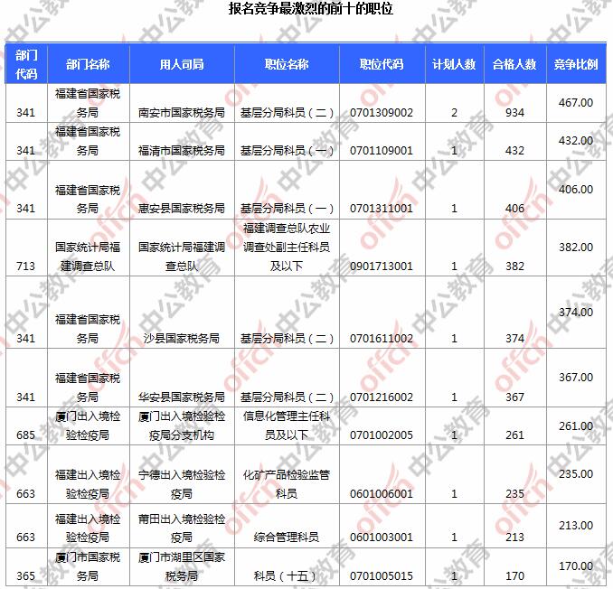 為幫助廣大考生更清晰的了解今日報(bào)名情況,福建中公網(wǎng)校整理了審核通過人數(shù)前10位的部門以及競爭比例最激烈的10大部門,供廣大考生參考: