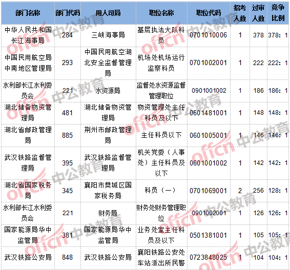截止到10月20日8時(shí),報(bào)名通過(guò)審核人數(shù)和競(jìng)爭(zhēng)比例的職位為三峽海事局基層執(zhí)法大隊(duì)科員一職,招錄1人,過(guò)審人數(shù)378人,競(jìng)爭(zhēng)比例為378:1。具體信息如下: