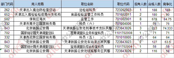 報名通過審核人數(shù)前十的職位主要集中在天津出入境邊防檢查總站、天津出入境檢驗檢疫局分支機構(gòu)、保稅區(qū)海關(guān),具體信息如下: