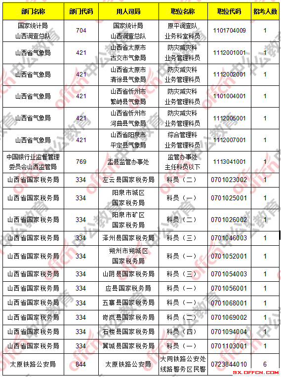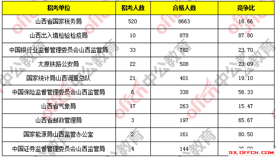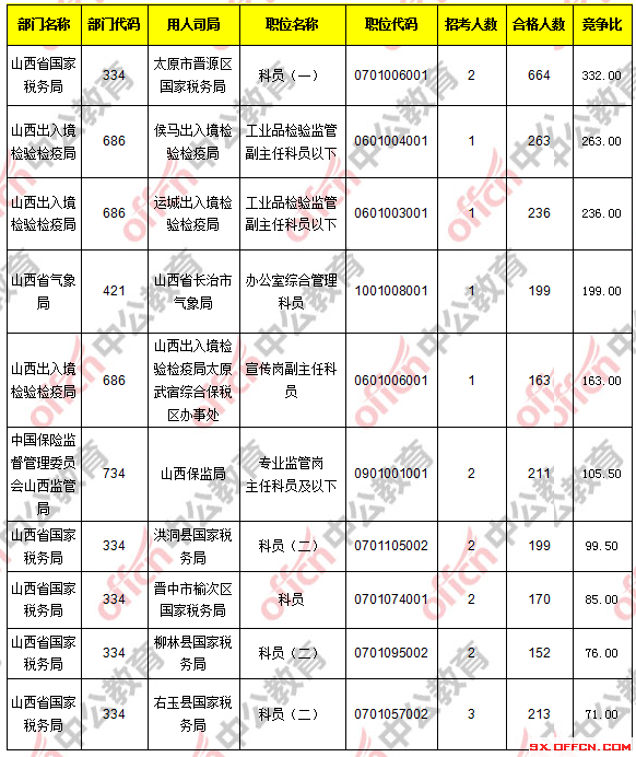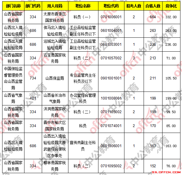 報(bào)考人數(shù)前十的職位主要集中在山西省國家稅務(wù)局、山西出入境檢驗(yàn)檢疫局這兩個(gè)部門,具體信息如下: