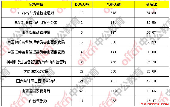 為幫助廣大考生更清晰的了解今日?qǐng)?bào)名情況,山西中公網(wǎng)校整理了合格人數(shù)前十位的部門以及競爭比例最激烈的十大部門,供廣大考生參考: