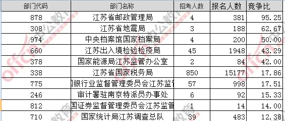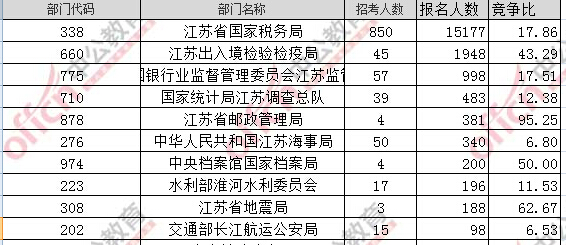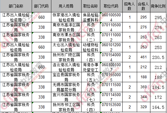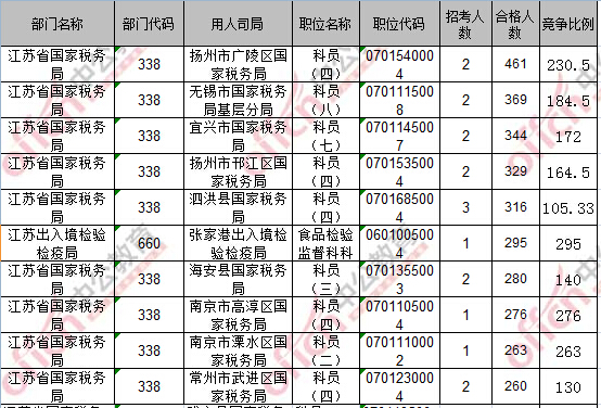 報(bào)名通過(guò)審核人數(shù)前十的職位主要集中在江蘇省國(guó)家稅務(wù)局、江蘇出入境檢驗(yàn)檢疫局,具體信息如下: