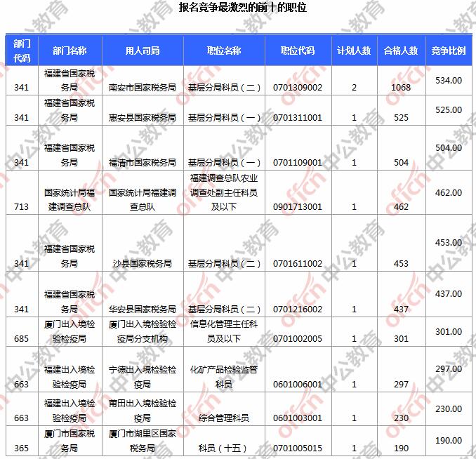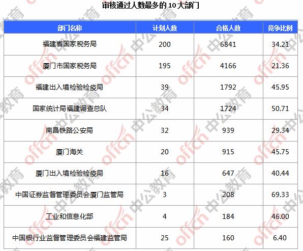 為幫助廣大考生更清晰的了解今日報名情況,福建中公網(wǎng)校整理了審核通過人數(shù)前10位的部門以及競爭比例最激烈的10大部門,供廣大考生參考: