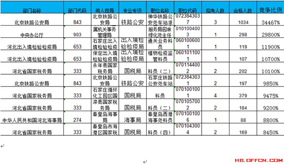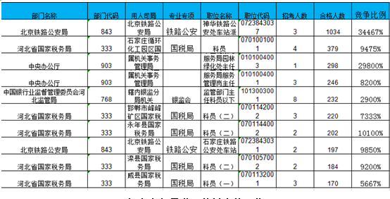 報名通過審核人數(shù)前十的職位主要集中在北京鐵路公安局、河北省國家稅務局、中央辦公廳等部門,具體信息如下: