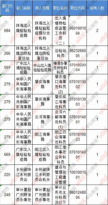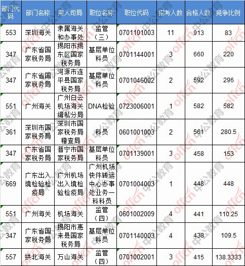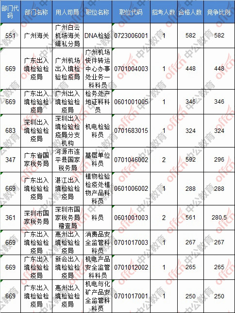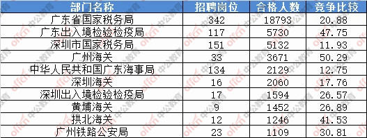 報(bào)名通過審核人數(shù)前十的職位主要集中在深圳海關(guān)、廣東省國家稅務(wù)局、廣州海關(guān),具體信息如下: