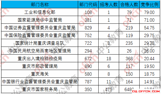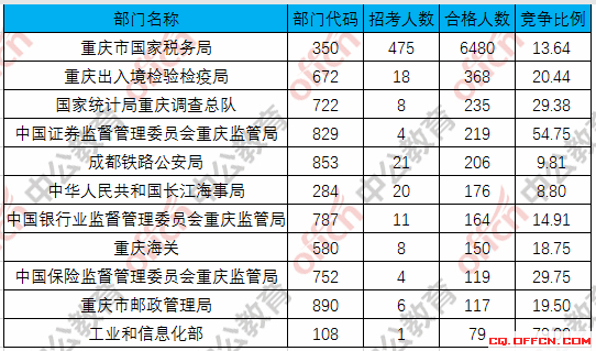 為幫助廣大考生更清晰的了解今日?qǐng)?bào)名情況,重慶中公教育整理了合格人數(shù)前十位的部門以及競(jìng)爭(zhēng)比例最激烈的十大部門,供廣大考生參考: