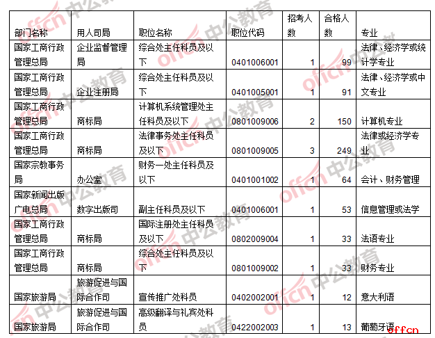 這些職位均不要求考生為服務基層服務人員,均來自中央國家行政機關(本級)或參照公務員法管理事業(yè)單位,不限政治面貌,要求考生學歷為本科以上,無任何備注要求,目前競爭比不足100:1,且面試比例為5:1,機會較高。除了國家旅游局旅游促進與國際合作司高級翻譯與禮賓處科員一職對工作經(jīng)驗無限制以外,其余職位均只要求2年基層工作經(jīng)歷,且這些職位覆蓋了法律、經(jīng)濟學、中文、財務、計算機、小語種等范圍較廣的專業(yè),相信符合條件的考生能從這些職位中找到適合自己的職位。