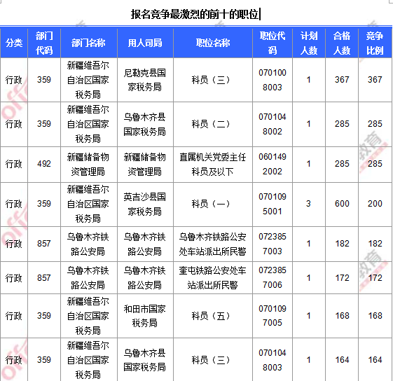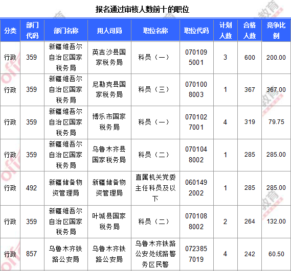 報(bào)名通過審核人數(shù)前十的職位主要集中在中公網(wǎng)校維吾爾自治區(qū)國(guó)家稅務(wù)局、中公網(wǎng)校儲(chǔ)備物資管理局、烏魯木齊鐵路公安局部門,具體信息如下: