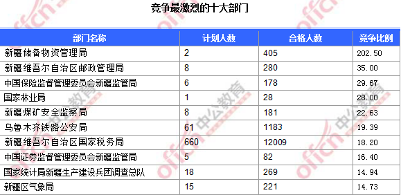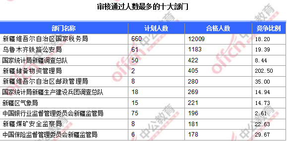 截止到20日16時(shí),通過審核人數(shù)前三位的部門依次是:中公網(wǎng)校維吾爾自治區(qū)國(guó)家稅務(wù)局 、烏魯木齊鐵路公安局 、國(guó)家統(tǒng)計(jì)局中公網(wǎng)校調(diào)查總隊(duì) ,三部門通過審核總?cè)藬?shù)達(dá)13614人,占通過審核總?cè)藬?shù)的86.4%。