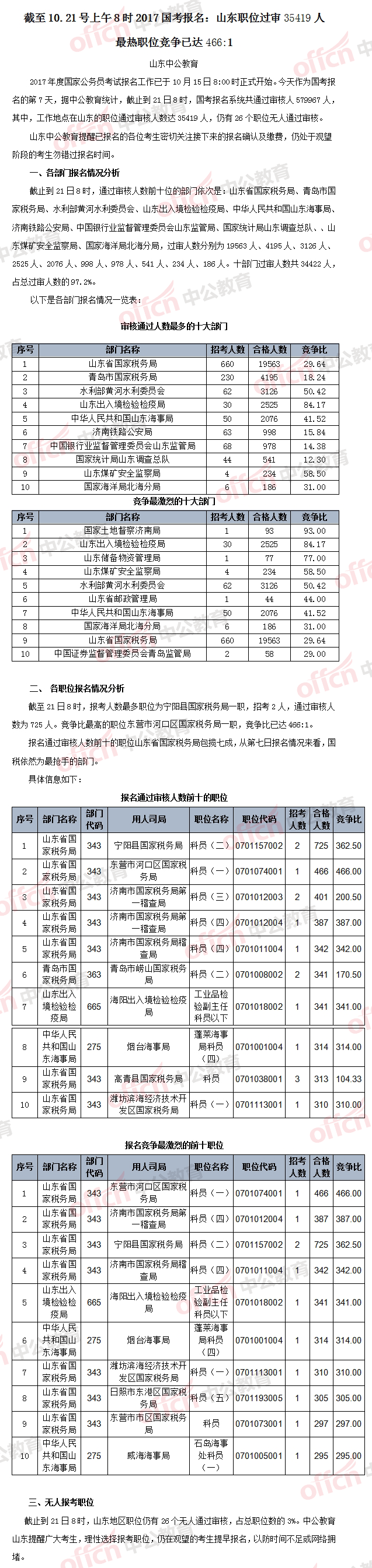 【截至21日8時(shí)】2017國考報(bào)名山東職位過審35419人 最熱職位競(jìng)爭已達(dá)466:1