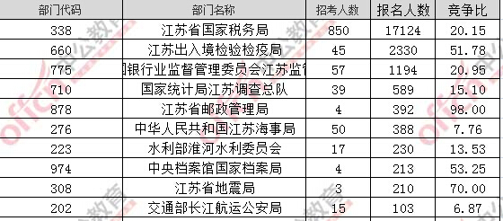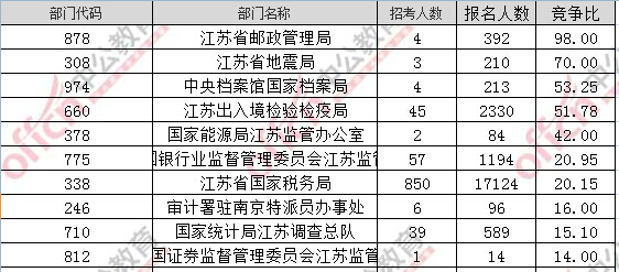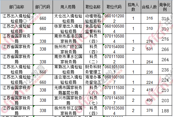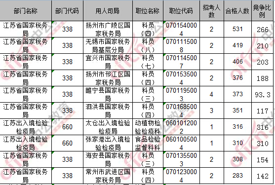 報名通過審核人數前十的職位主要集中在江蘇省國家稅務局、江蘇出入境檢驗檢疫局,具體信息如下: