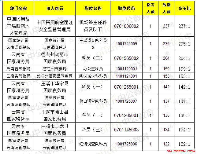 截止21日8時(shí),招錄比例的職位為中國(guó)民用航空局西南地區(qū)管理局機(jī)場(chǎng)處主任科員及以下,職位代碼是0701006002,招錄1人,通過(guò)人數(shù)237人,競(jìng)爭(zhēng)比237:1
