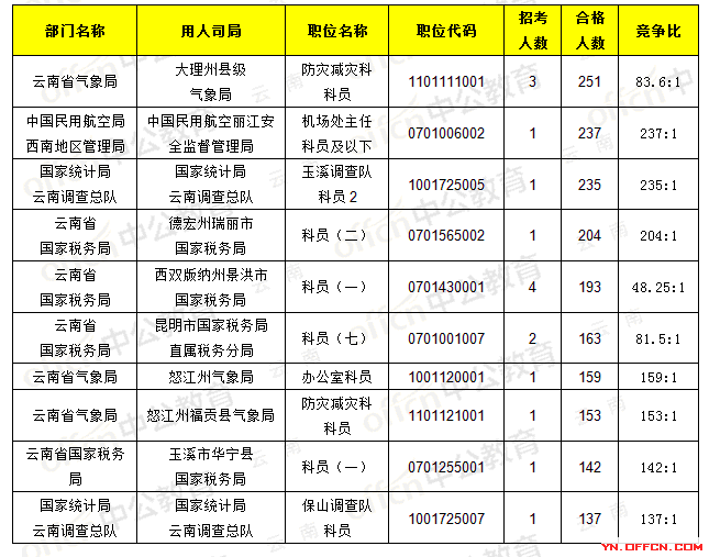 報(bào)名通過(guò)審核人數(shù)前十的職位主要集中在云南省氣象局、中國(guó)民用航空局西南地區(qū)管理局、國(guó)家統(tǒng)計(jì)局云南調(diào)查總隊(duì),具體信息如下: