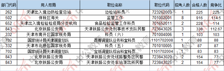 報(bào)名通過審核人數(shù)前十的職位主要集中在保稅區(qū)海關(guān)、北京鐵路公安局、天津出入境檢驗(yàn)檢疫局分支機(jī)構(gòu),具體信息如下: